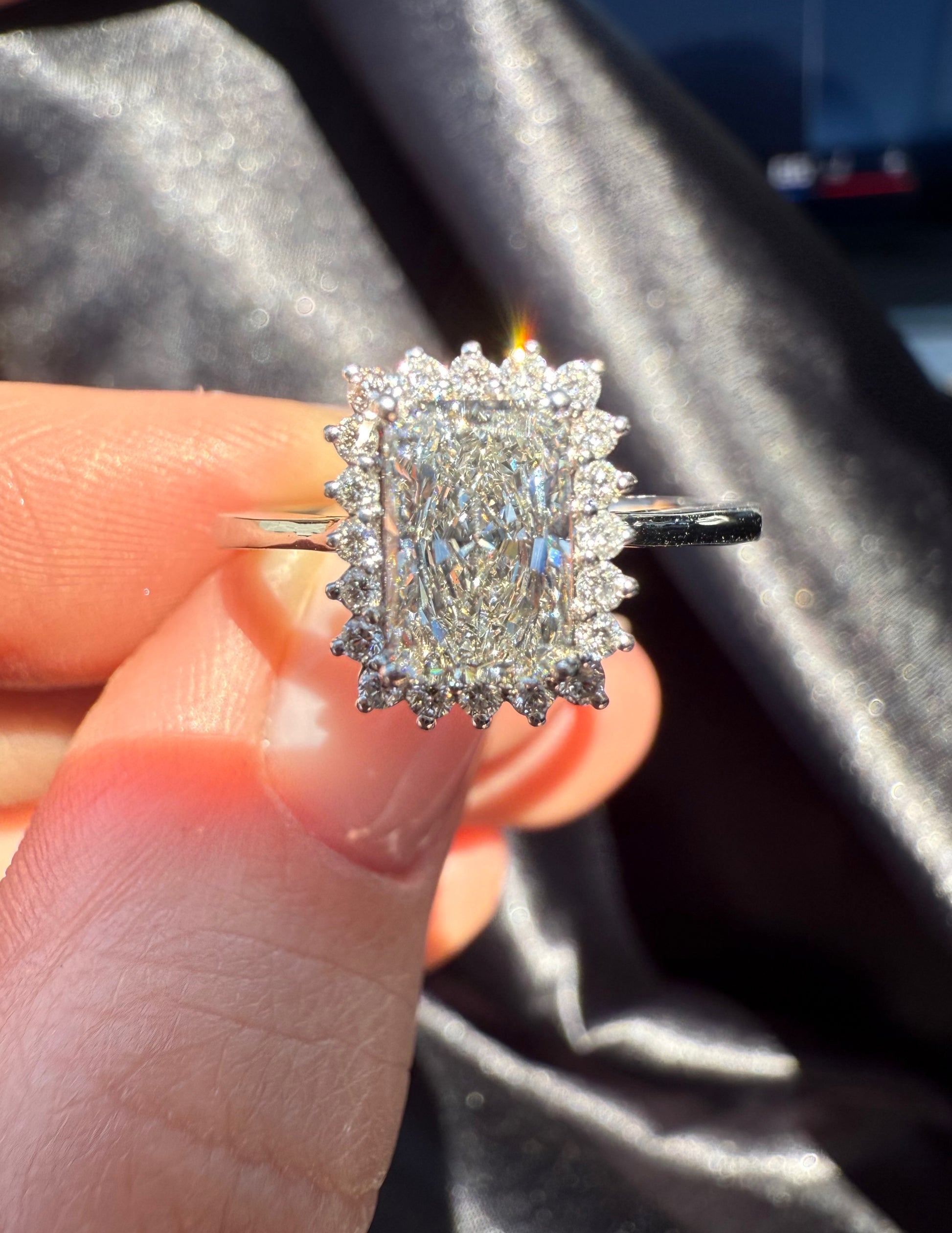 This stunning diamond engagement ring features a radiant cut center stone, surrounded by a halo of smaller diamonds. Crafted in high-quality white gold, it exudes elegance and sophistication, making it the perfect symbol of love and commitment.